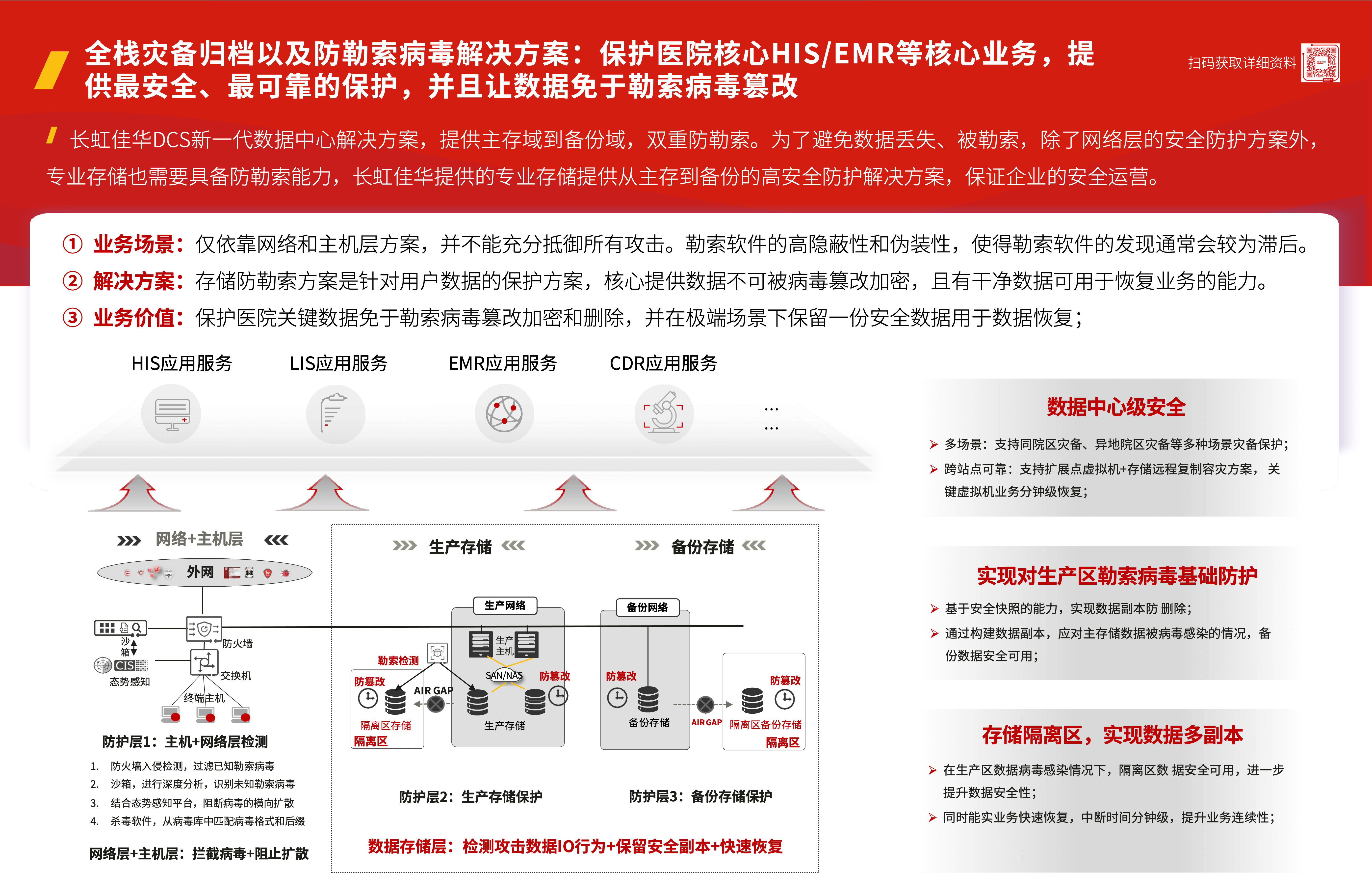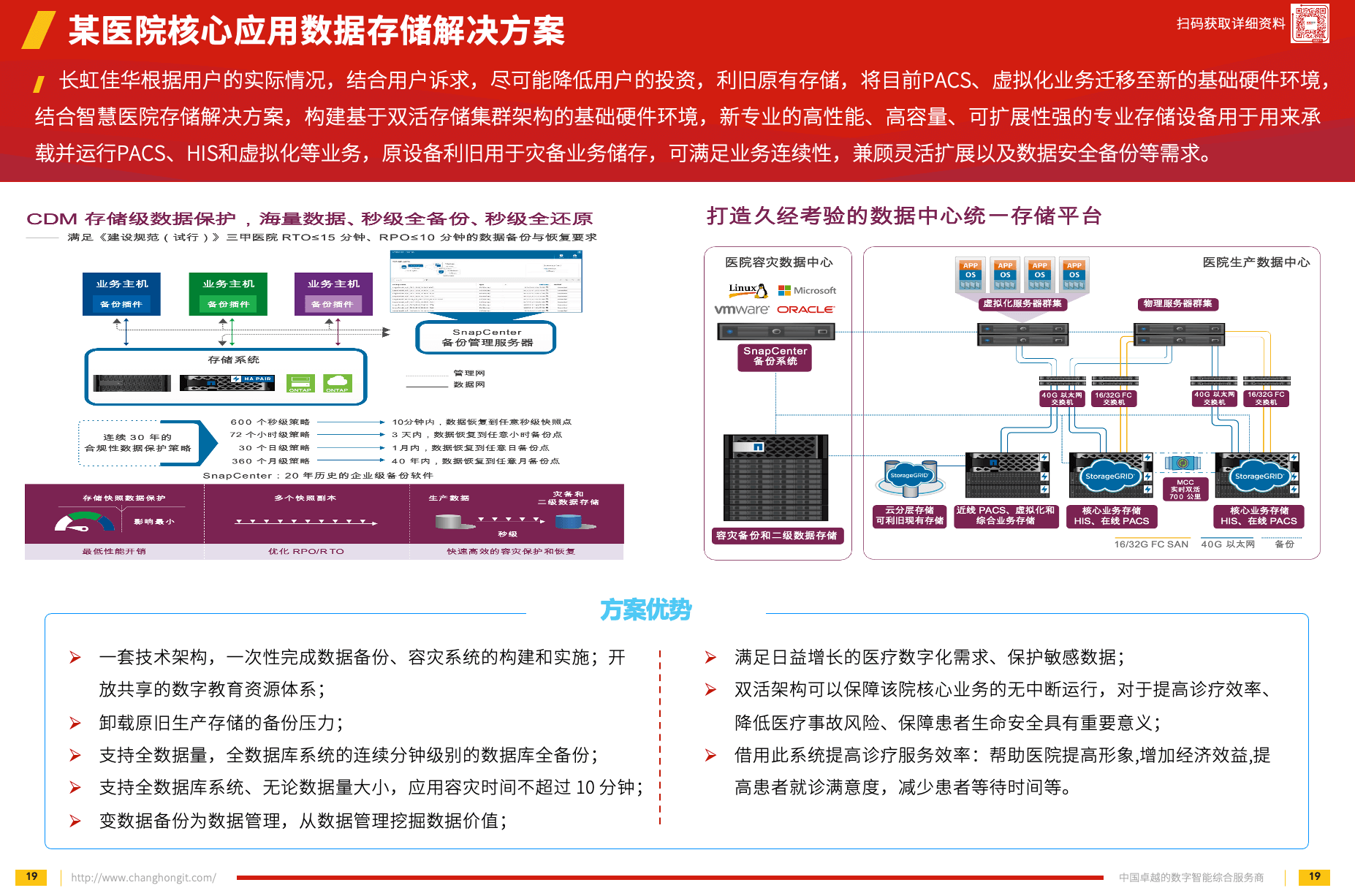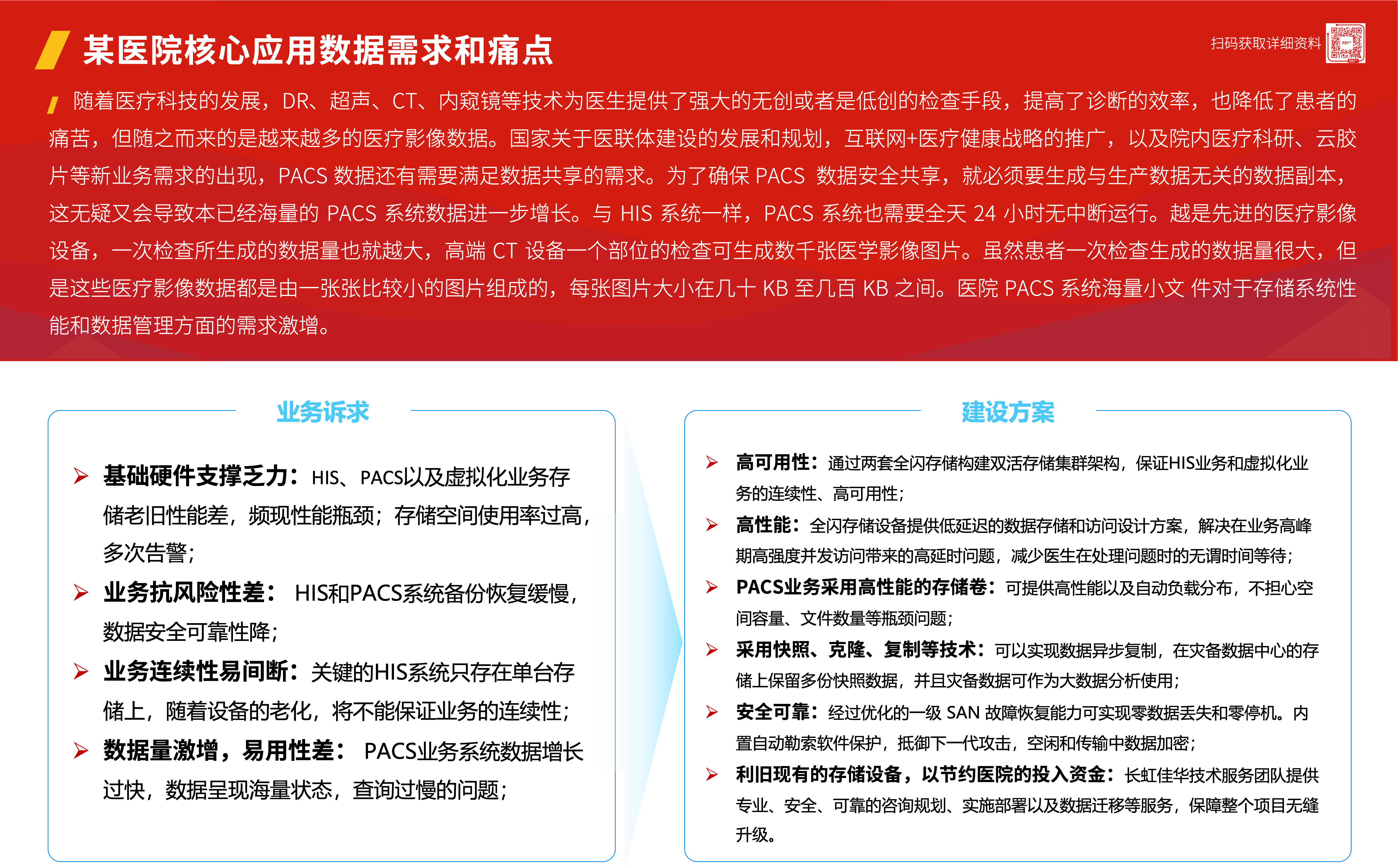 针对医院关键核心业务的需求,长虹3044永利集团依托在存储领域的丰富经验,联合行业内各专业存储、数据管理的厂商推出各类契合用户实际需求的整体解决方案,在提供高性能存储的基础上,保障了业务连续性,同时能够异构旧有存储,提升资源利用率,从而满足医院核心业务场景的数据存储需求。
