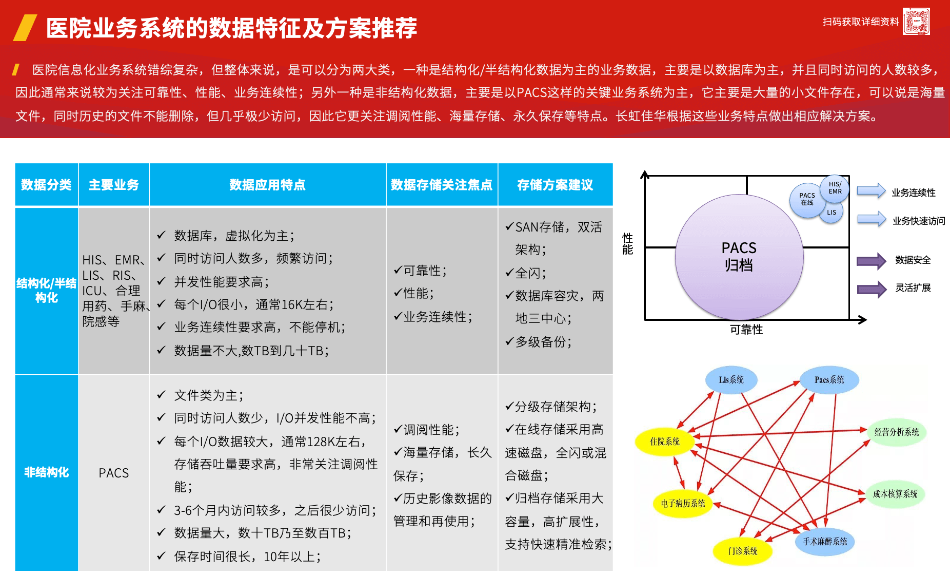 医院信息化业务系统错综复杂,但整体来说,是可以分为两大类,一种是结构化/半结构化数据为主的业务数据,主要是以数据库为主,并且同时访问的人数较多,因此通常来说较为关注可靠性、性能、业务连续性;另外一种是非结构化数据,主要是以PACS这样的关键业务系统为主,它主要是大量的小文件存在,可以说是海量文件,同时历史的文件不能删除,但几乎极少访问,因此它更关注调阅性能、海量存储、永久保存等特点。长虹3044永利集团根据这些业务特点做出相应解决方案。