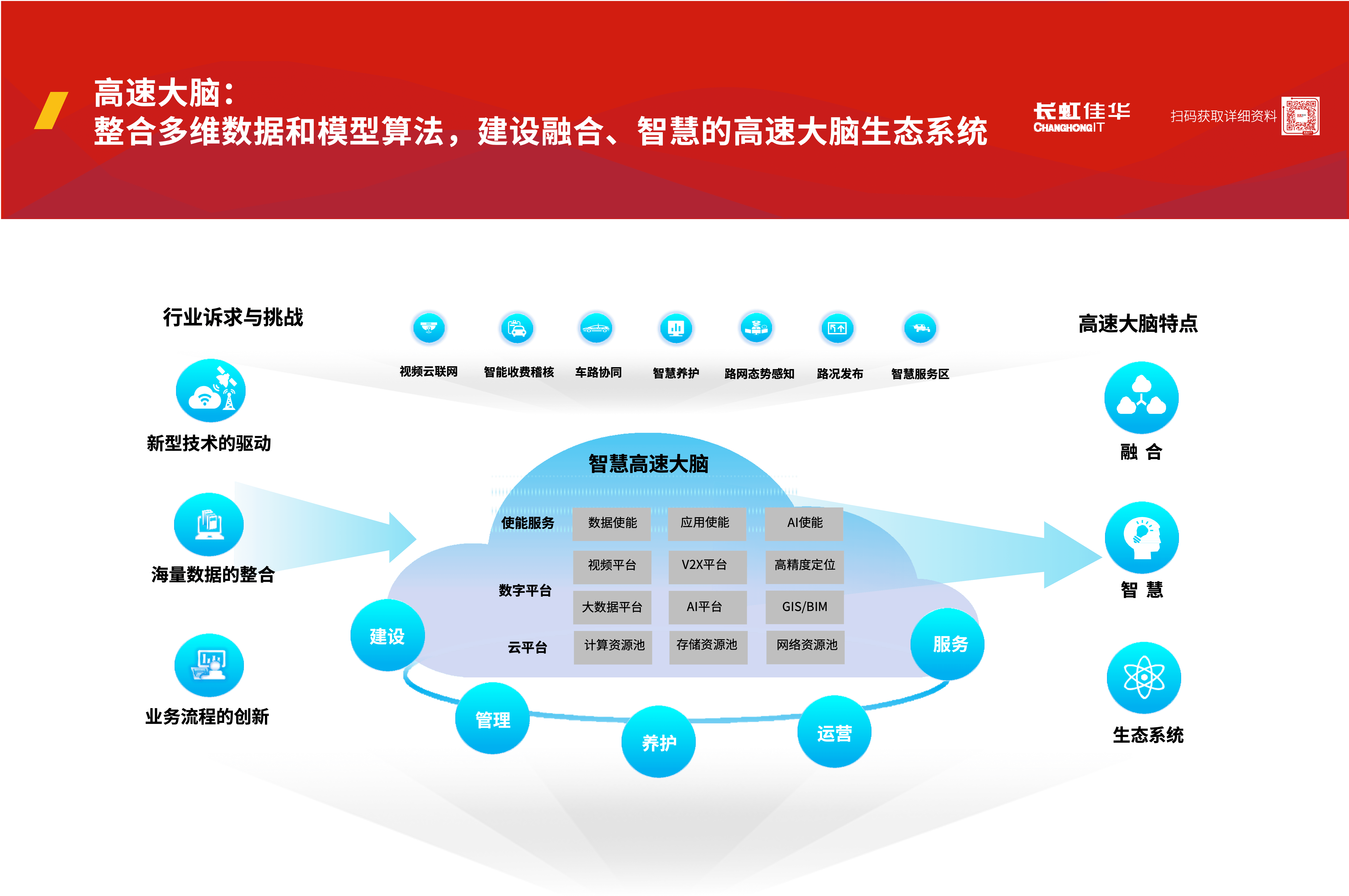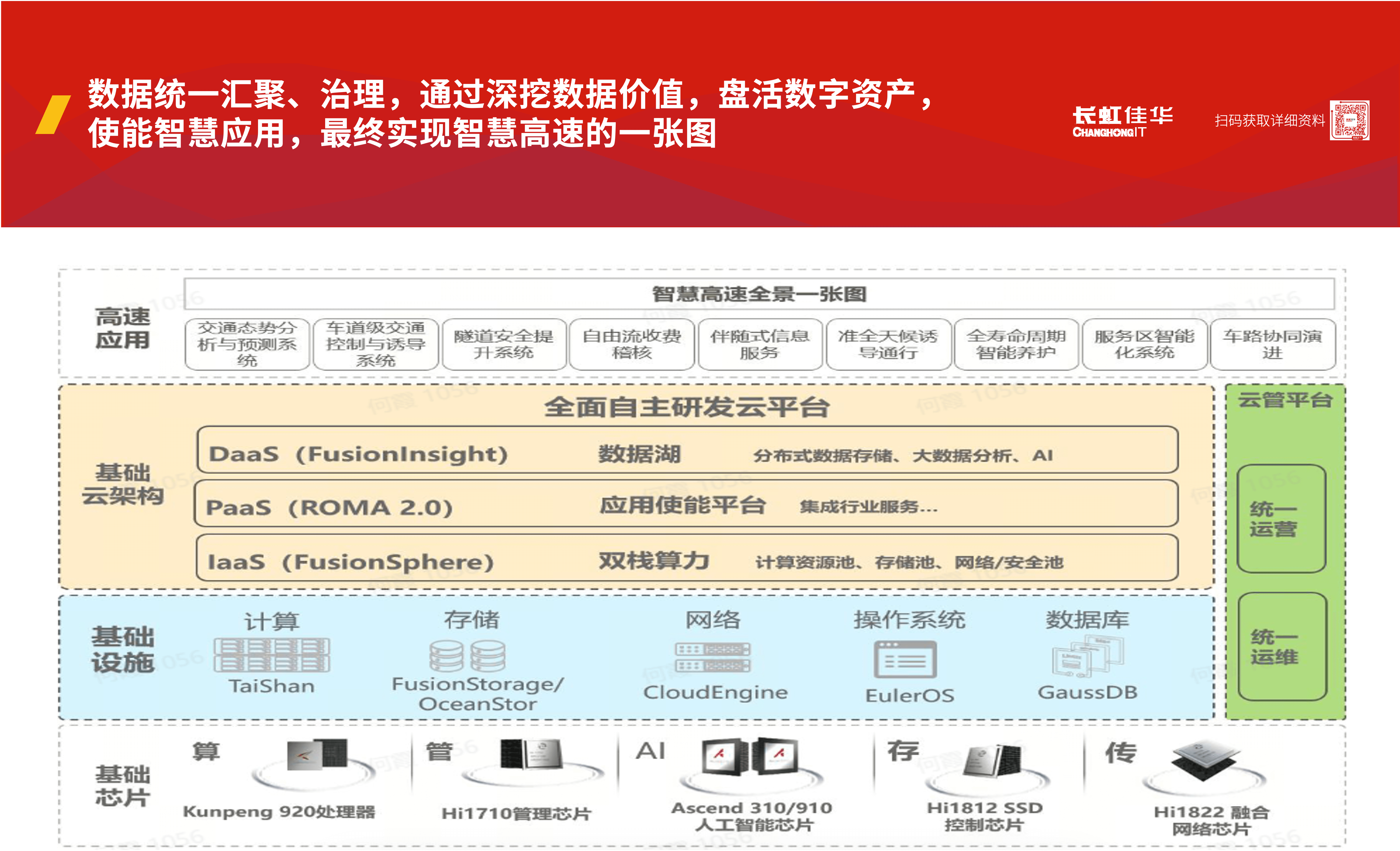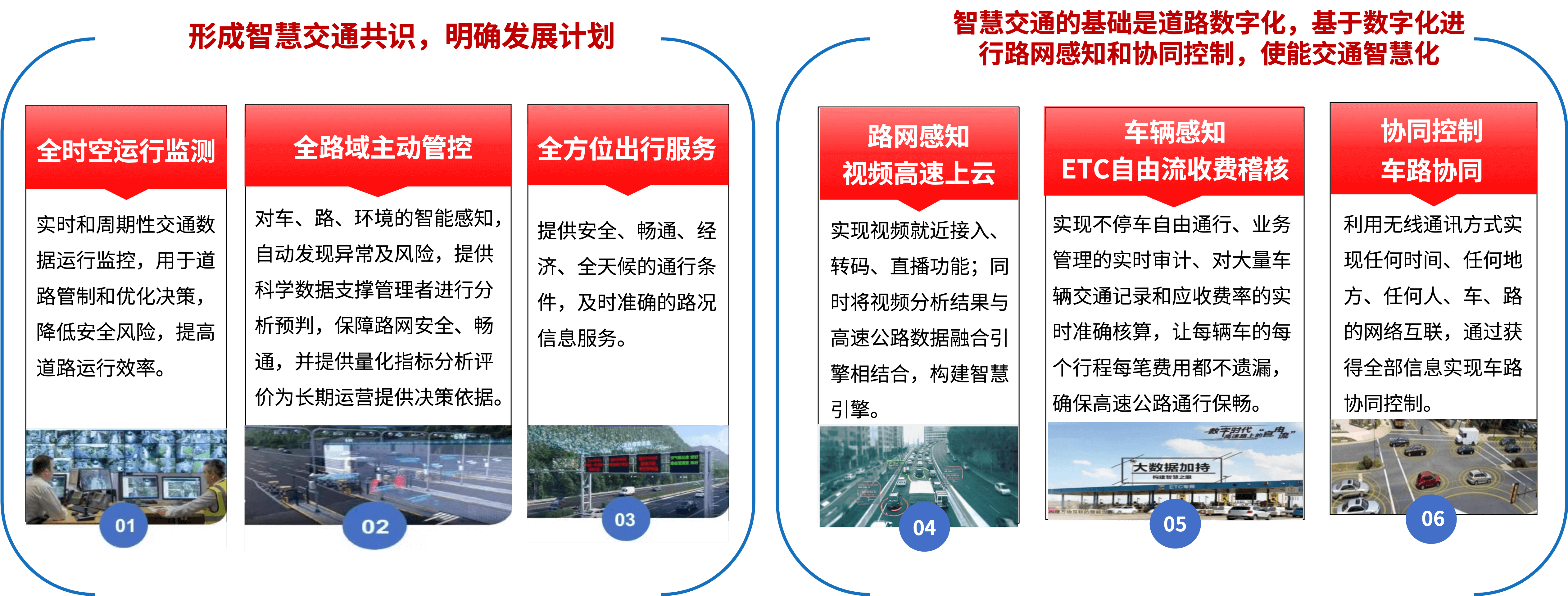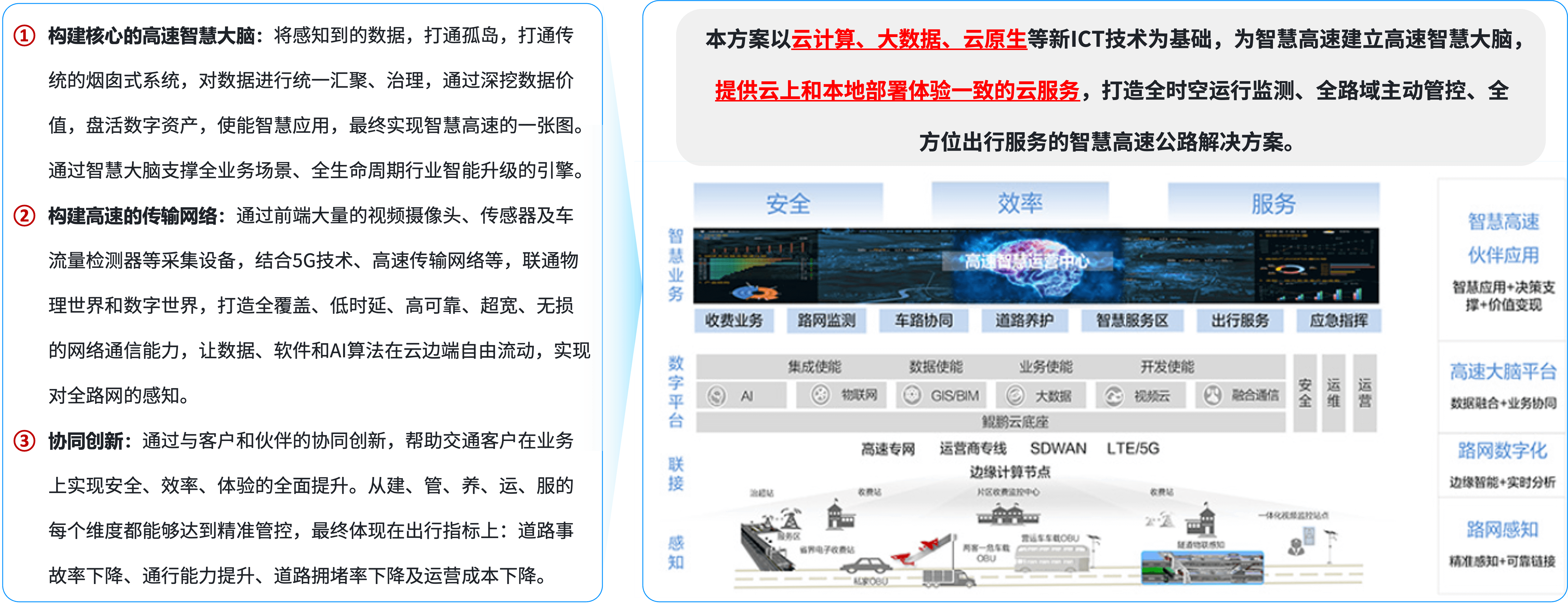 以云计算、大数据、云原生等新ICT技术为基础,打造全时空运行监测、全路域主动管控、全方位出行服务的智慧高速公路解决方案。