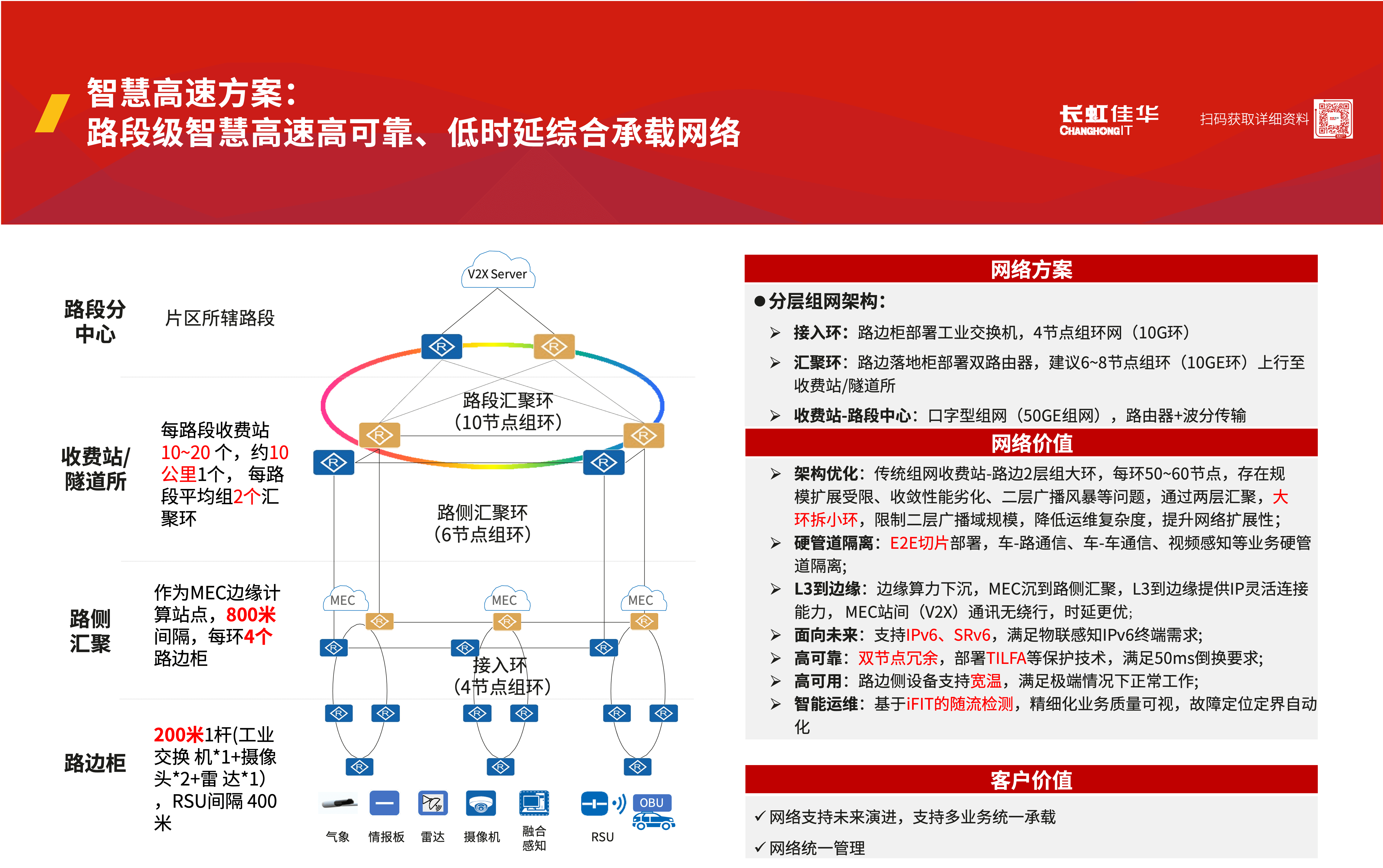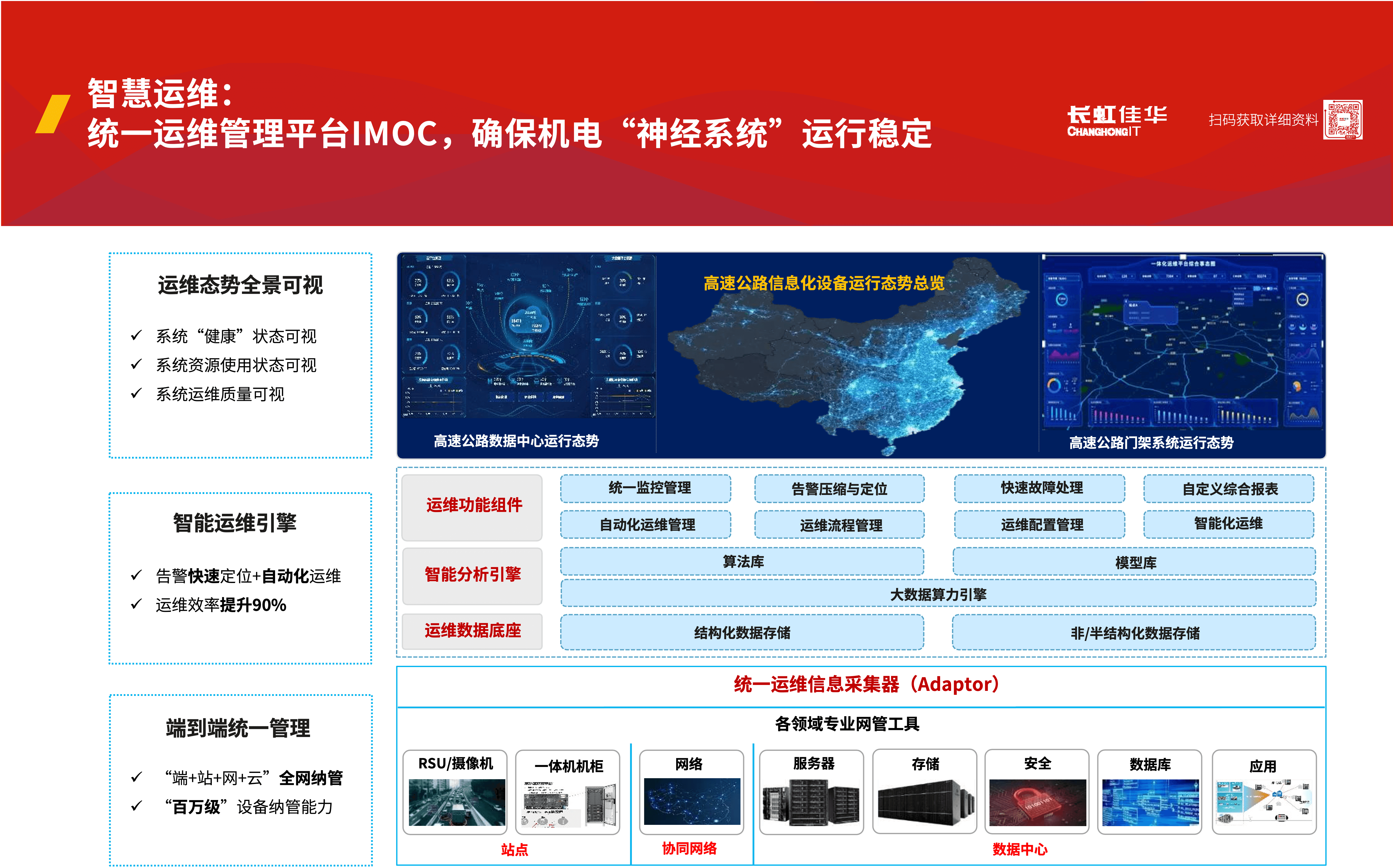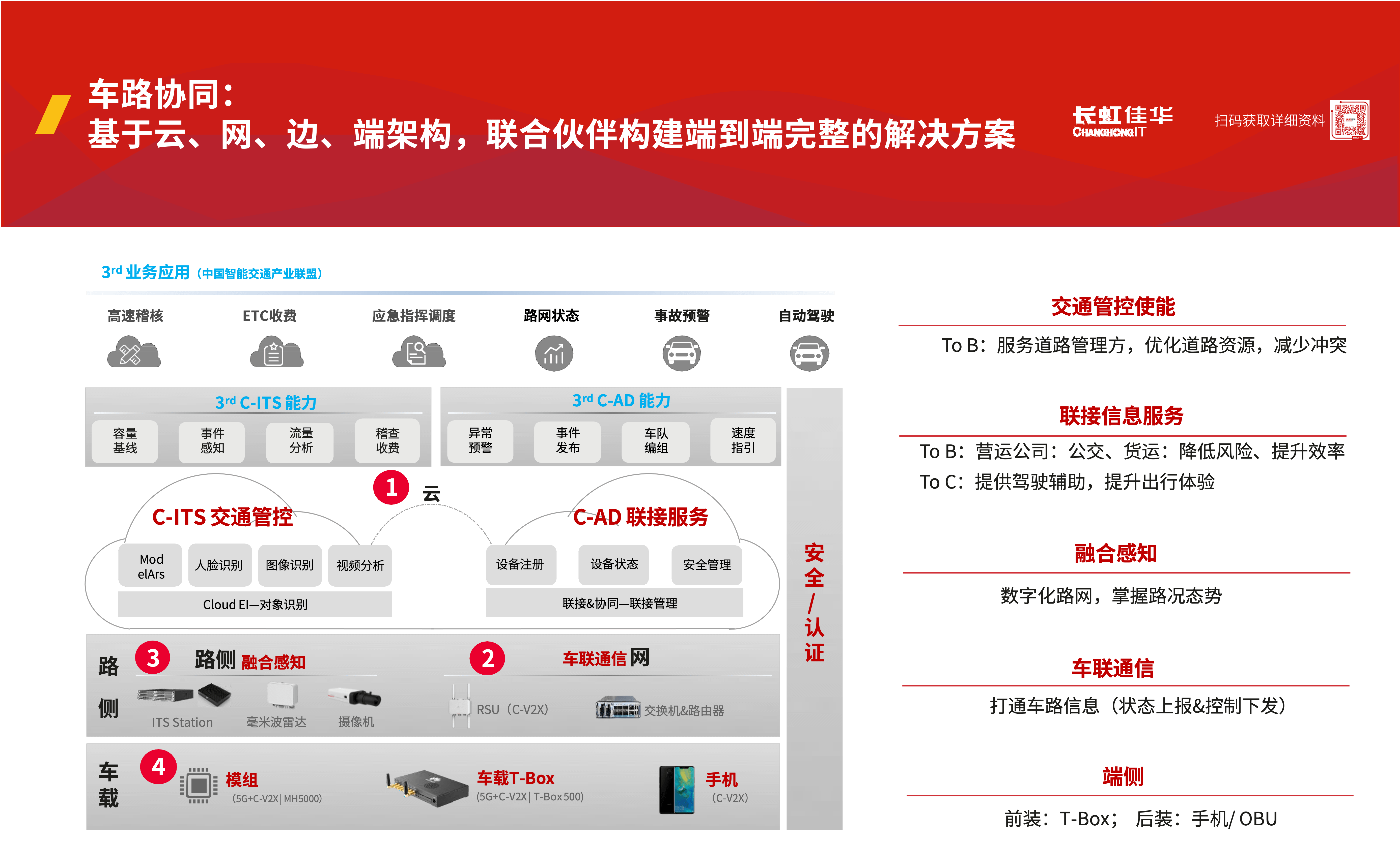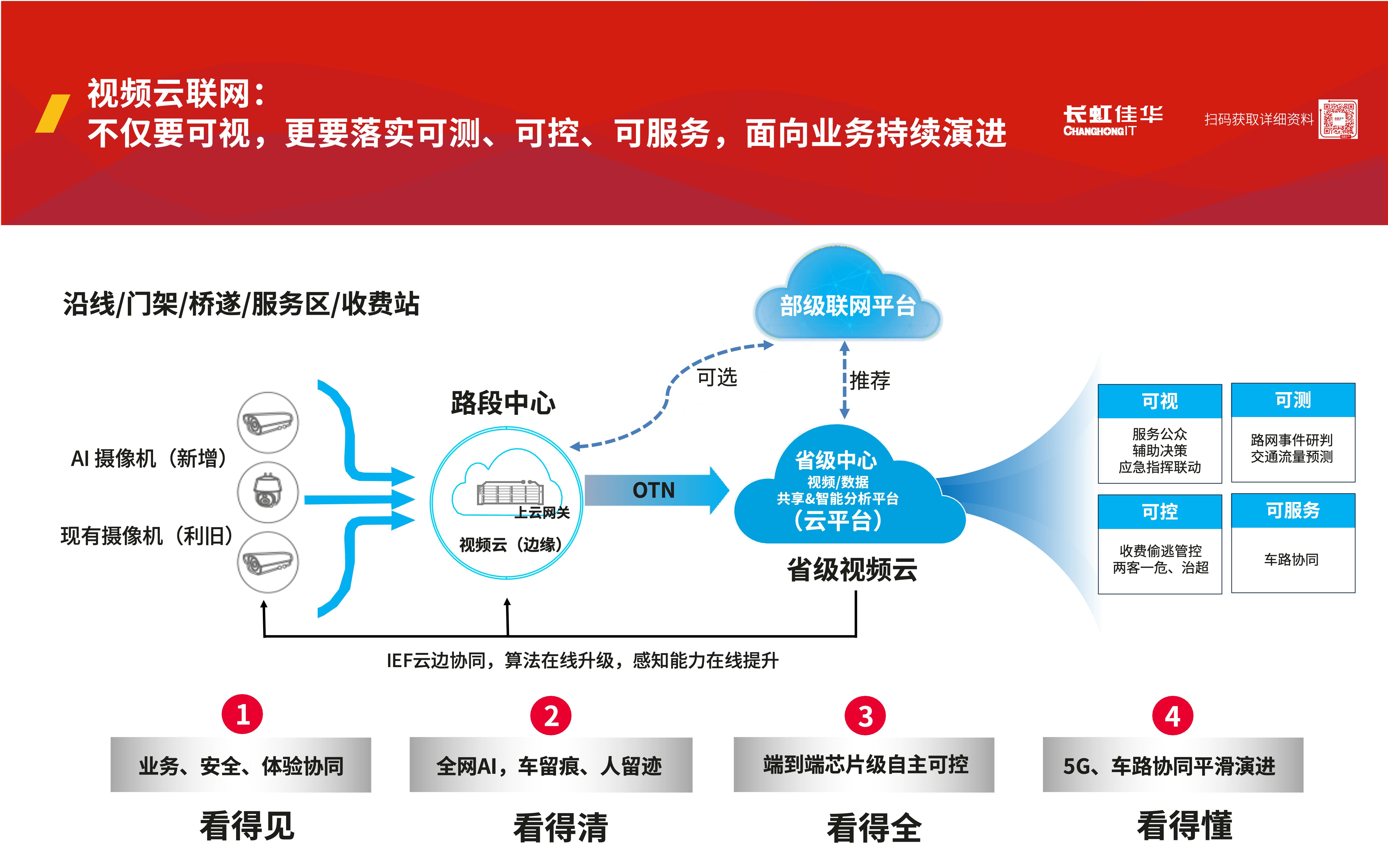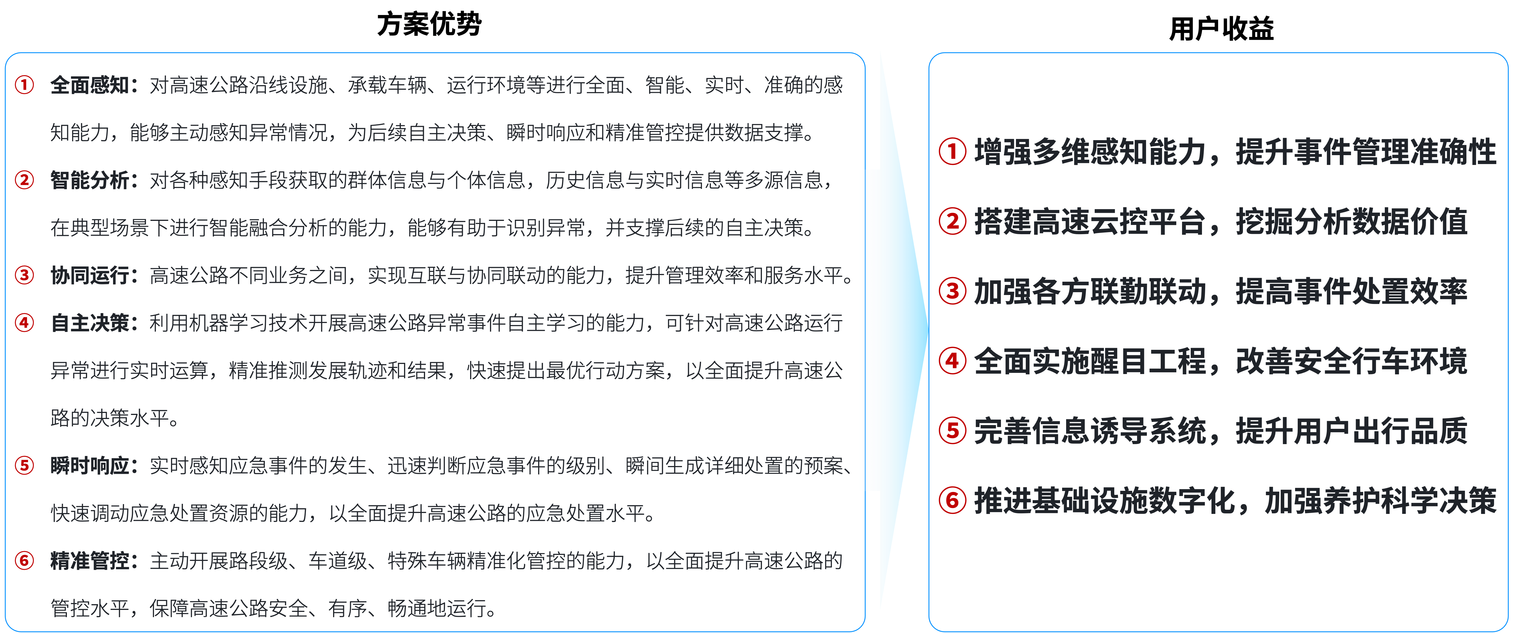以云计算、大数据、云原生等新ICT技术为基础,打造全时空运行监测、全路域主动管控、全方位出行服务的智慧高速公路解决方案。