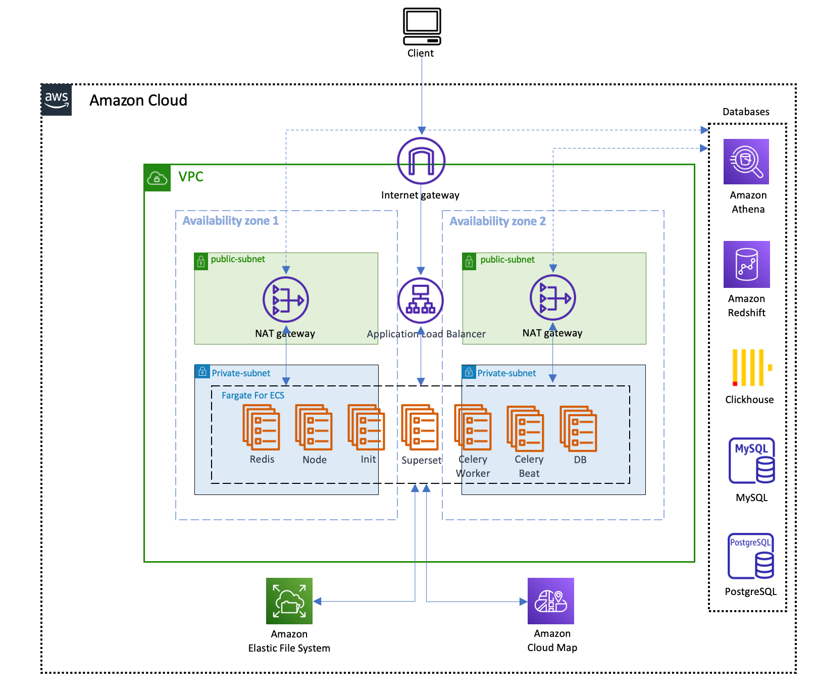 该方案充分利用云计算的可扩展、分布式、无服务器架构等特点,帮助客户快速构建并使用商业智能(Business Intelligence,BI),从而推动企业实现从数据驱动认知到数据驱动决策的转变。该方案利用Amazon ECS Fargate实现Apache Superset功能模块的资源调度,以及对外服务的生命周期管理;利用Amazon EFS实现系统数据、元数据、查询数据的存储和缓存;利用Amazon Cloud Map实现服务之间的服务发现和寻址,旨在消除客户搭建和运维Apache Superset的成本开销,提供更为成熟完整的方案,降低使用Apache Superset的门槛。