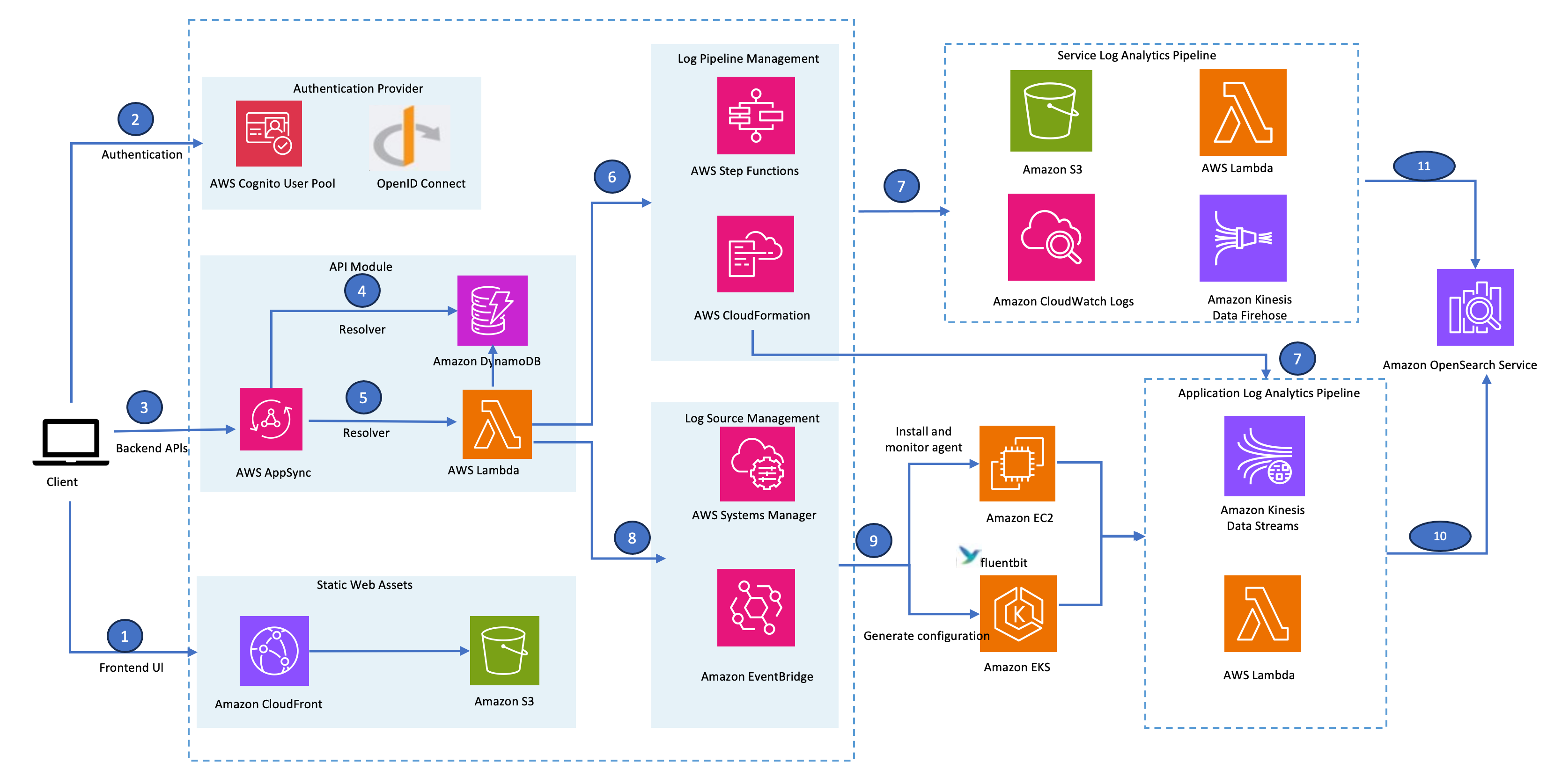 日志通解决方案提供全面的日志管理和分析功能,帮助您简化日志分析管道的构建。该解决方案基于 Amazon OpenSearch Service 构建,可让您有效地完成日志摄取、日志处理和日志可视化。该解决方案可应用于多类场景,例如满足安全和合规性需求,实现精细化的业务运营,或者增强 IT 故障排除和维护。