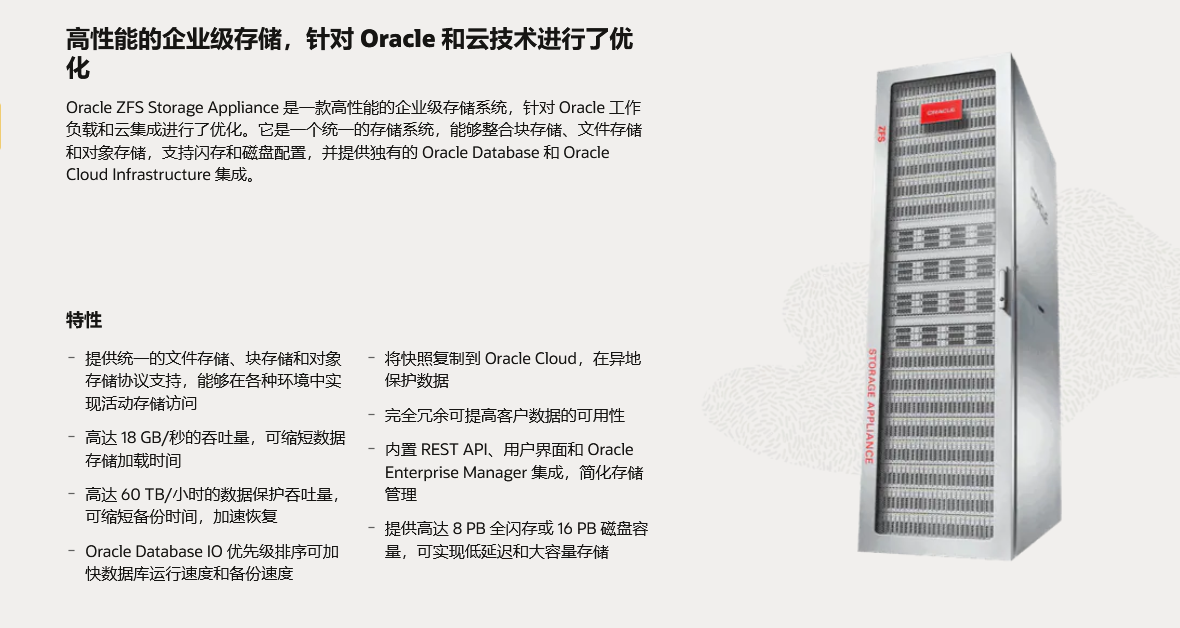 Oracle ZFS Storage Appliance 是一款高性能的企业级存储系统,针对 Oracle 工作负载和云技术集成进行了优化。它是一个统一的存储系统,让客户能够在一个平台上整合文件存储、块存储和对象存储。Oracle ZFS 兼具高闪存性能和 PB 级存储容量,助力客户以峰值速度运行所有工作负载。此外,该系统内置有各种 Oracle Database 集成功能(包括自动对数据库 IO 进行优先级排序),可帮助 IT 部门优化工作负载性能和减少管理工作量,从而降低总拥有成本 (TCO)。