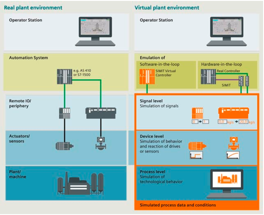 SIMIT 虚拟控制:使用 SIMIT Virtual Controller,可针对任何规模的系统进行测试和培训,无需使用实际硬件,无需对自动化程序进行任何改动。其 I/O 可与仿真模型交换信号。