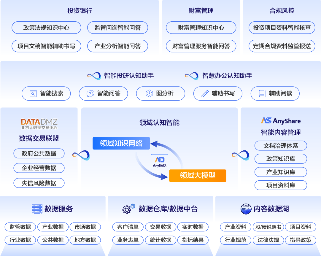 业务智能化:建立从外部数据到内部数据,从结构化数据到非结构化数据的全域数据平台,形成领域认知智能能力应用于投研、质控、财富管理等多个核心场景提高人效,实现数据的智能化应用