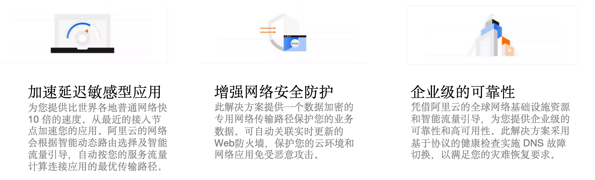 互联网应用加速解决方案面向各行各业的互联网应用,提供一站式加速网络访问、提高网络稳定性的服务。 阿里云网络基础设施部署遍及全球,采用集中式 IT 管理,控制企业间的网络连接,实现网络服务全球范围就近接入和跨地域部署,提升服务可用性和性能,为客户提供了不同场景下的网络应用安全加速服务。