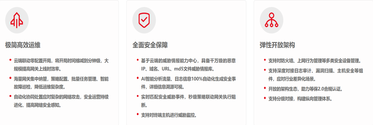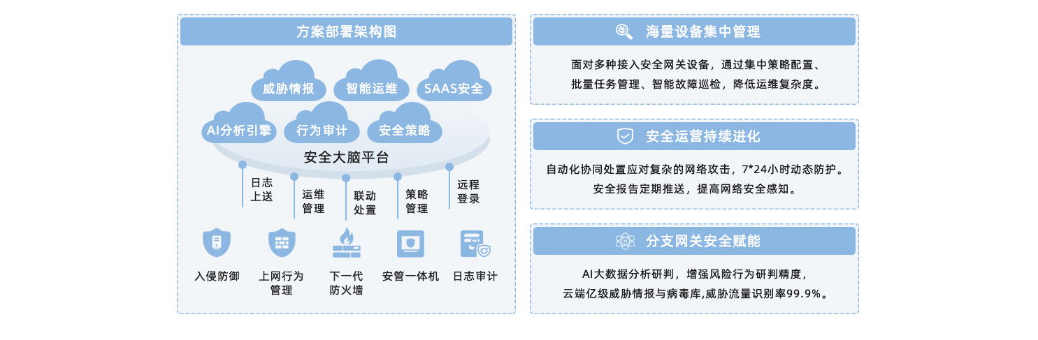 安全大脑平台与安全网关协同联动,将平台侧大智能、强算力、高敏锐的云SaaS化安全能力向本地安全网关进行输送。简化海量网关运维工作,加强边缘侧安全态势感知度,提升安全事件处置效率,形成立体化主动安全运营体系。