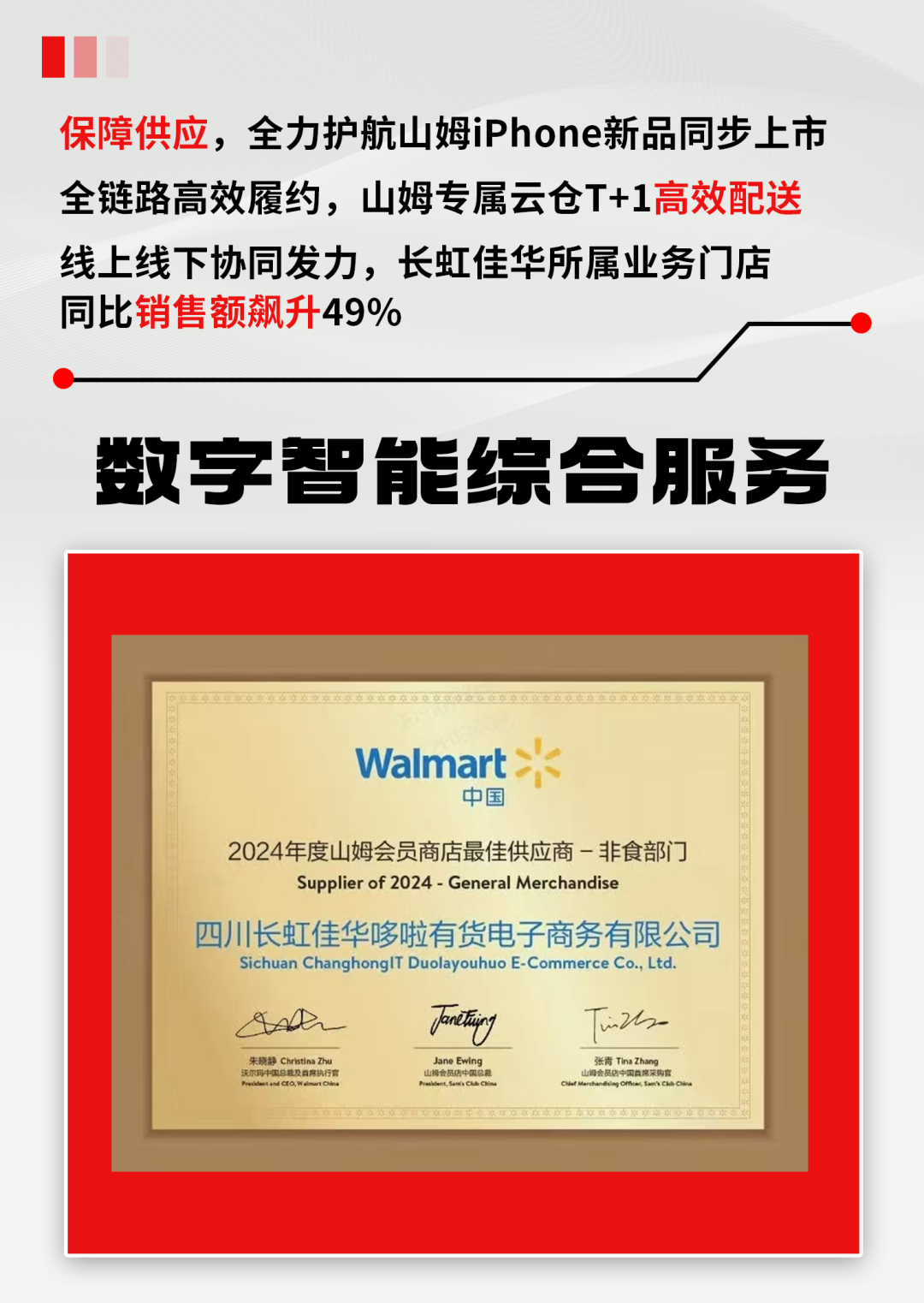 在近日備受矚目的2025年沃爾瑪中國供應商峯會上,長虹佳華以創新供應鏈模式、深化終端服務,助力山姆門店業務成長,榮膺2024年度山姆會員商店(非食部門)最佳供應商,成爲山姆非食類僅有的兩家獲獎供應商之一。