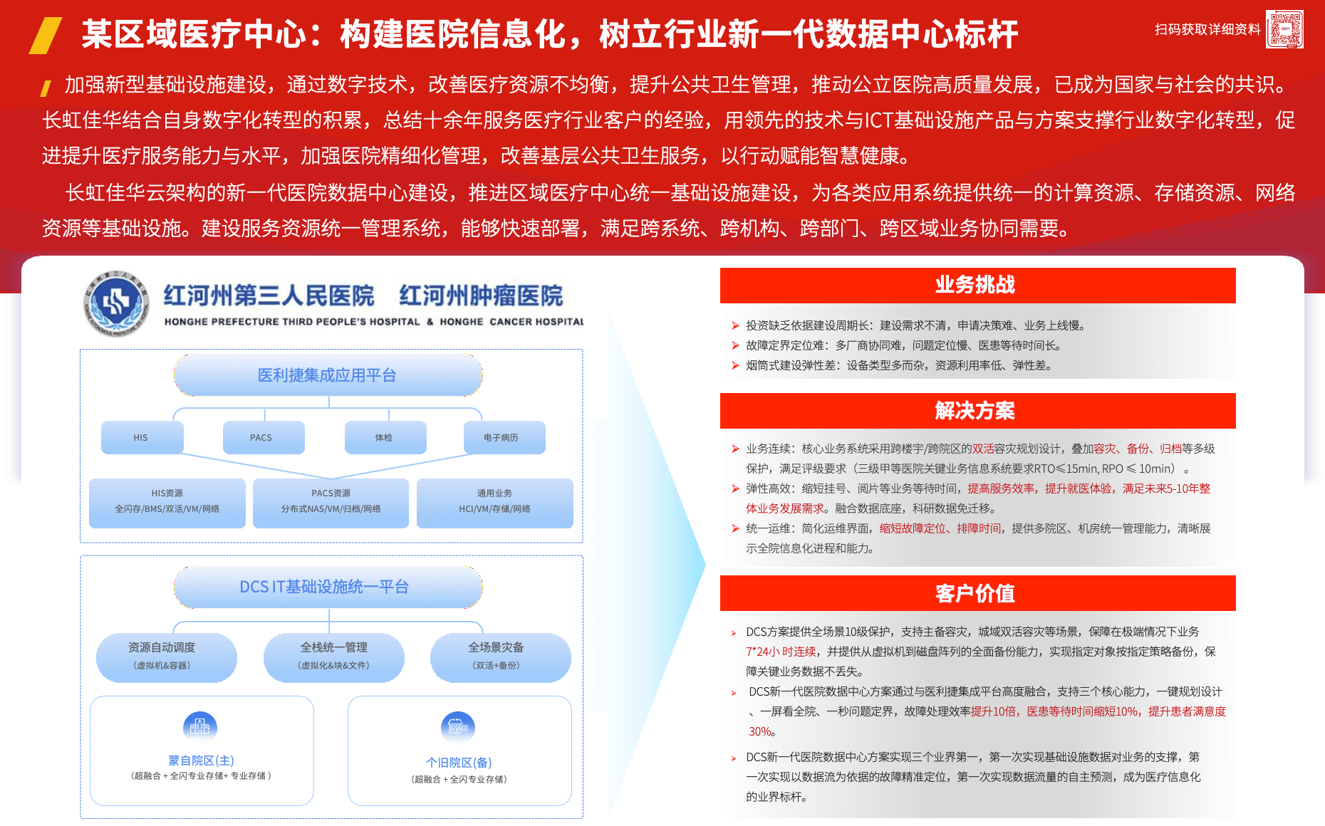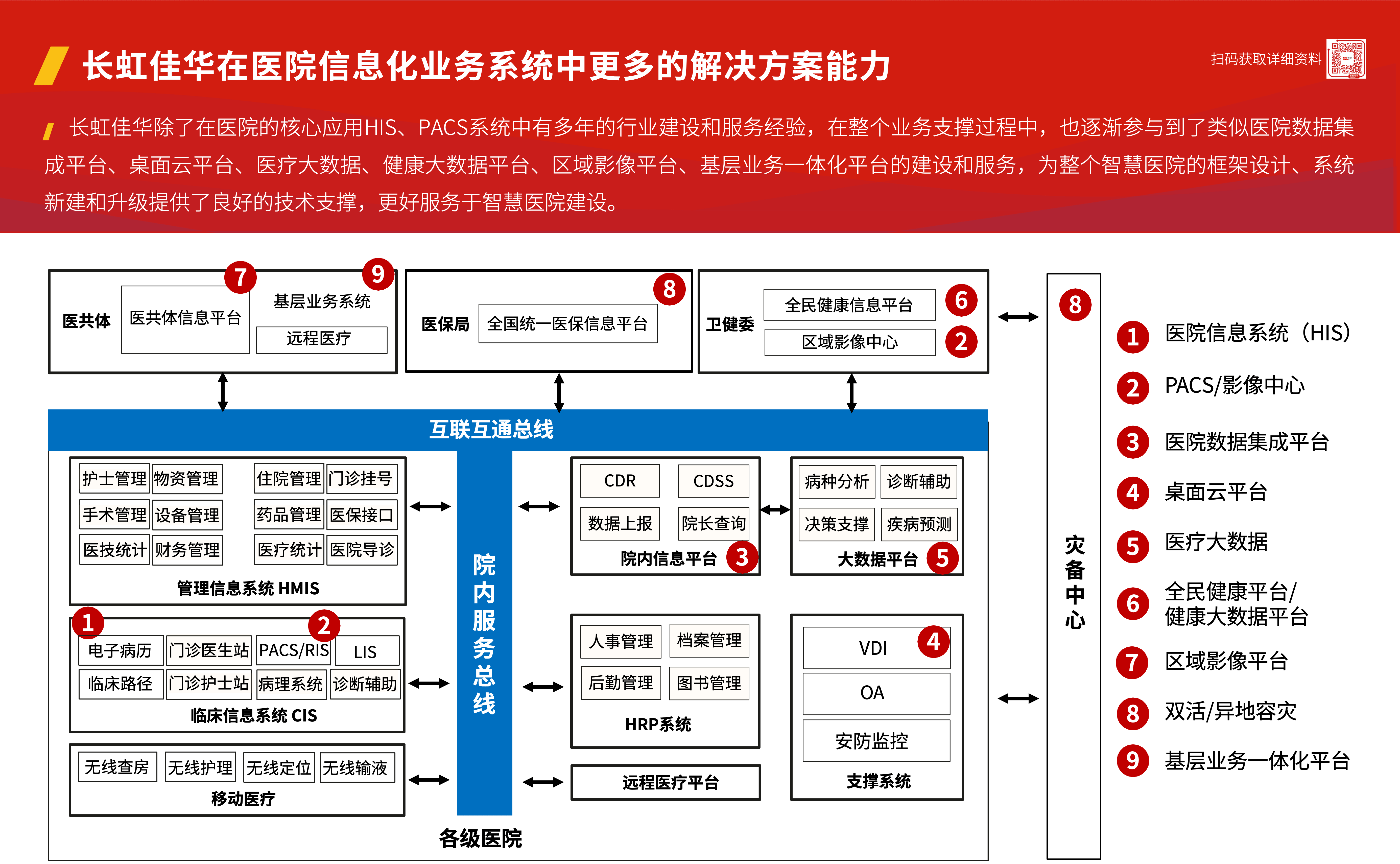 響應國家號召《健康中國2030規劃綱要》,長虹佳華依託上游雲廠商及自身的技術服務能力,基於各類雲資源(私有云、混合雲、公有云),通過高性能、高可靠、高安全的數字化底座與業內頂級醫療合作伙伴一起,爲醫療行業客戶提供完善的醫療應用和服務體系。